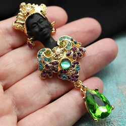 Брошь из золотистого металлического сплава в виде легендарной царицы Савской с эмалью, стразами, кристаллами.