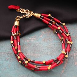Браслет из натурального красного коралла, золотого, серебренного гематита, позолоченной латунной фурнитуры (Чехия).