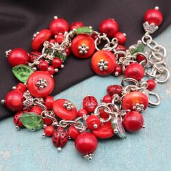 В браслете использовано 5 видов коралловых бусин, оригинальные бусины в виде божьих коровок и листочков с серебряным покрытием из богемского стекла.