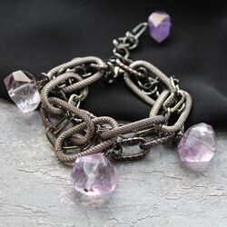 Браслет из цепей цвета темного серебра с родиевым покрытием, натурального аметиста.