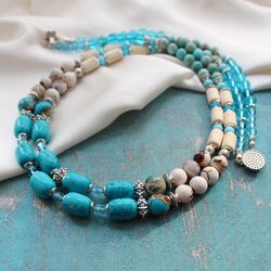 Красивое, сложное в своих "хитросплетениях" украшение с "легким" характером! Потрясающие оттенки и орнаменты на камнях гармонично переплавились в этой необыкновенной работе! Естественные природные рисунки на бирюзе созвучны с подобными на природном материале - кости, а, сложные с включением дополнительных коричневых, бежевых оттенков варисциты "спелись" в такт с керамическими бусинами ручной работы! Ну, и прозрачные бусины из красивейшего голубого стекла нужны как воздух этой яркой композиции с такими "земными" камнями!