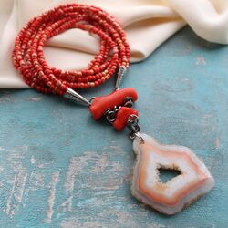 Ожерелье из натурального коралла, среза ага с потрясающей хрустальной друзой, керамики, посеребренной и стальной фурнитуры.