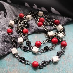 Колье из белой лавы, красного коралла, богемского стекла в форме бублика, цепей.
