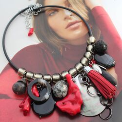 Колье из натурального красного коралла, агата, турмалинового кварца, яшмы, перламутра, лавы, замши, муранского стекла, каучука.