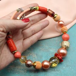 Колье из натурального коралла, сердолика, лавы, каучука, богемского стекларазнообразных видов и форм, фактурных бусин из металла с позолотой.