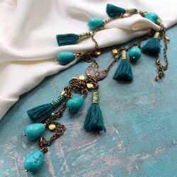 Колье - галстук из бирюзы (тонированного турквенита), шерстяных кисточек, латуни, бронзы.