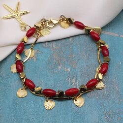 Браслет из натурального красного коралла, позолоченной фурнитуры 24К в виде ракушек и морских звездочек.