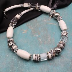 Ожерелье из натурального белого коралла, хрусталя, перламутра, керамики, гематита, вулканической лавы.