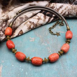 Бусы из натурального пористого коралла, бронзы, шелка.
