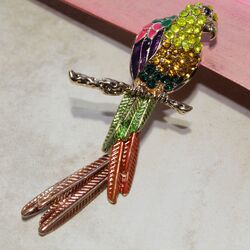 Брошь из металла золотистых оттенков, страз, эмали в виде экзотического попугайчика.