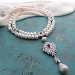 Ожерелье двухрядное, отлично держит форму с активной центральной частью - элементами в барочном стиле с рубиновыми кристаллами и потрясающей барочной грушевидной формой жемчужиной!