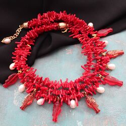 Ожерелье из натурального коралла, белоснежного жемчуга, рыбок ручной работы из стекла, позолоченной латунной фурнитуры ручной работы.