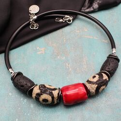 Ожерелье из натурального красного и черного кораллов, океанической лавы (туфа), бусин дзи "трехглазки".