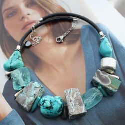 Ожерелье чокер из самородков бирюзы (турквенита), кварца, хризоколлы, каучука, стекла.