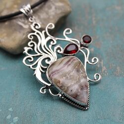 Подвеска из слоистого агата, гранатового кварца, посеребрение 925 пробы.