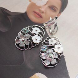 Серьги из ракушки абалон (гелиотис, морское ушко), белого и коричневого резного перламутра, родированной фурнитуры, серебра.