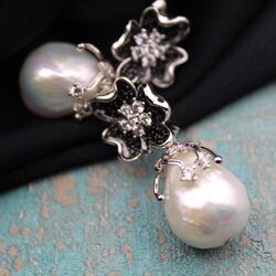 Серьги из барочных жемчужин, посеребренной родированной фурнитуры с черными, бесцветными микроцирконами.