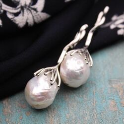 Серьги из белоснежного барочного жемчуга, посеребренной родированной фурнитуры.