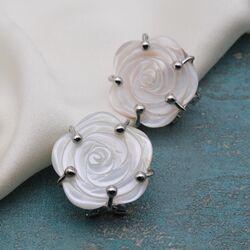 Серьги-гвоздики из резного белого перламутра, посеребренного сплава с родированным покрытием.