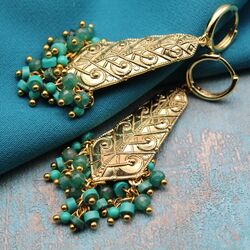 Серьги из зеленой бирюзы, изумруда (корунда), позолоченной 24 К латуни, серебра.