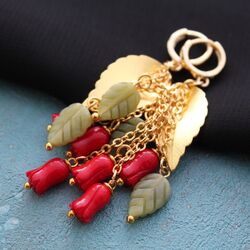 Серьги из резного красного коралла, резного природного нефрита, позолоченной 24К с родированным покрытием фурнитурой.
