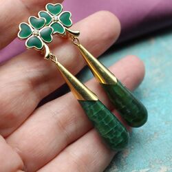Серьги из зеленого агата с эффектом "кракле", позолоченной латуни, эмали, цирконов.