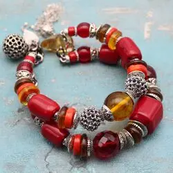 Сет браслетов из натурального крупного красного коралла, янтаря, богемского стекла, орнаментированных бусин, посеребренной фурнитуры.