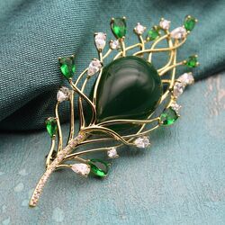Брошь-подвеска в виде объемного пера из зеленого агата, кристаллов.