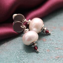 Серьги из натурального белоснежного жемчуга, граната альмадина, хирургической стали.