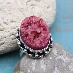 Кольцо из друзы розового цвета, посеребрение 925 пробы.