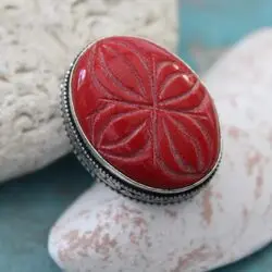 Кольцо из резного красного коралла, серебра 925 пробы.