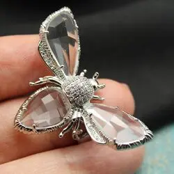 Кольцо в виде мухи из крупного прозрачного кристалла, страз, посеребрение 925.