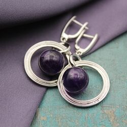 Серьги из натурального темно-лилового аметиста, посеребрение 925 пробы, родирование.