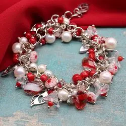 Браслет из натурального коралла, жемчуга, богемского стекла, посеребренной фурнитуры.