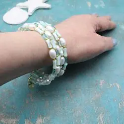 Браслет из натурального жемчуга, перламутра цвета "тиффани", богемского стекла, подвесок с серебряным и золотым 24К покрытием.