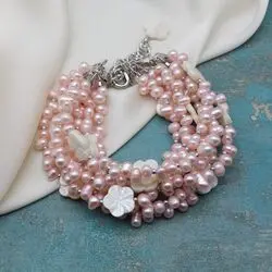Браслет из розового жемчуга резного белого перламутра в виде цветочков, посеребренной, родированной фурнитуры.
