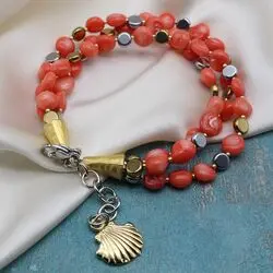 Браслет из натурального коралла, золотистого и серебристого гематита, позолоченной родированной фурнитуры.