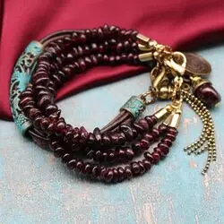 Сет из двух браслет из натурального граната, кожи, латуни с бирюзовой патиной, бронзы.