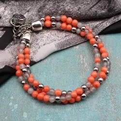 Браслет из натурального коралла, серого халцедона, гематита, посеребренной родированной фурнитуры.