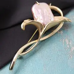 Брошь в виде объемного цветка из натурального барочного жемчуга, позолоченного сплава 24К.