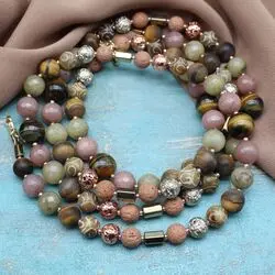 Длинные бусы из тигрового глаза, резного нефрита, халцедона, вулканической лавы.