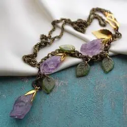 Нежное, женственное украшение из красивых сколов природного аметиста, стеклянных листиков ручной работы с росписью и великолепных латунных и бронзовых компонентов!