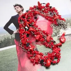 Колье из натурального красного коралла трех видов, гематита, посеребренных родированных цепочек.