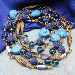 Колье из вулканического туфа (лавы), самородков бирюзы (тонированного турквенита), богемского стекла, филигранных элементов ручной работы из бронзы.