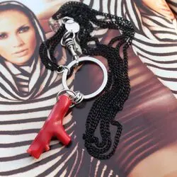 Колье из фрагмента красного коралла, черных цепей, элементов из стали.