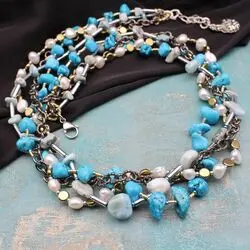 Колье из самородков бирюзы (турквенит), натурального жемчуга, ларимара, посеребренной цепи.