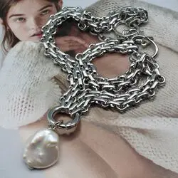 Колье из стильной цепи необычного дизайна посеребренной с родированным покрытием (р-ка Корея) и декоративной застежки с кулоном из крупной натуральной барочной жемчужины.