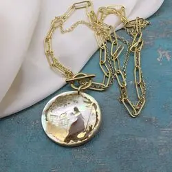 Колье из стильных цепочек позолоченных с родированным покрытием (р-ка Корея) и необычной подвески из натурального перламутра с с необычным принтом.