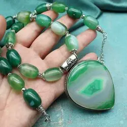 Колье из зеленого агата, крупной подвески с агатом, посеребрение 925.