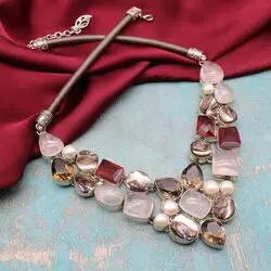 Ожерелье из натурального жемчуга, розового кварца, перламутра, дымчатого кварца, посеребрение 925 пробы.